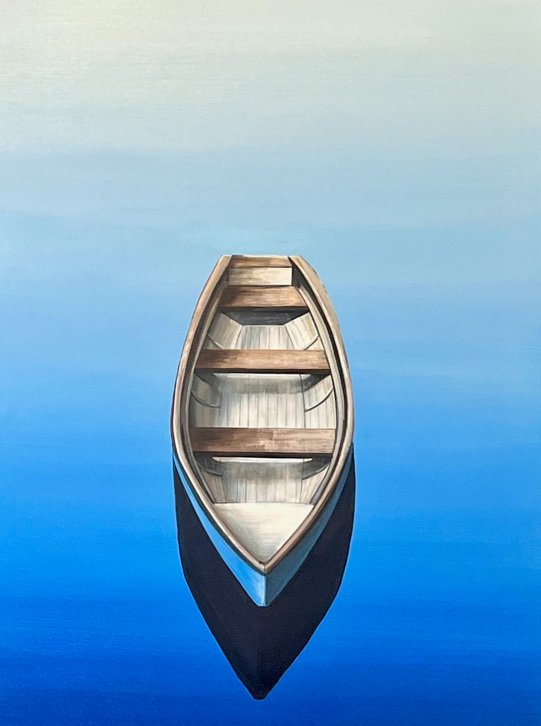 This acrylic painting offers a serene, overhead view of a solitary rowboat floating on a perfectly calm, blue water. The simplicity of the composition, with its clear lines and tranquil palette, evokes a profound sense of calm and peacefulness. This piece invites the viewer to pause, breathe, and offers a visual escape to a place of stillness and a moment of quiet introspection.