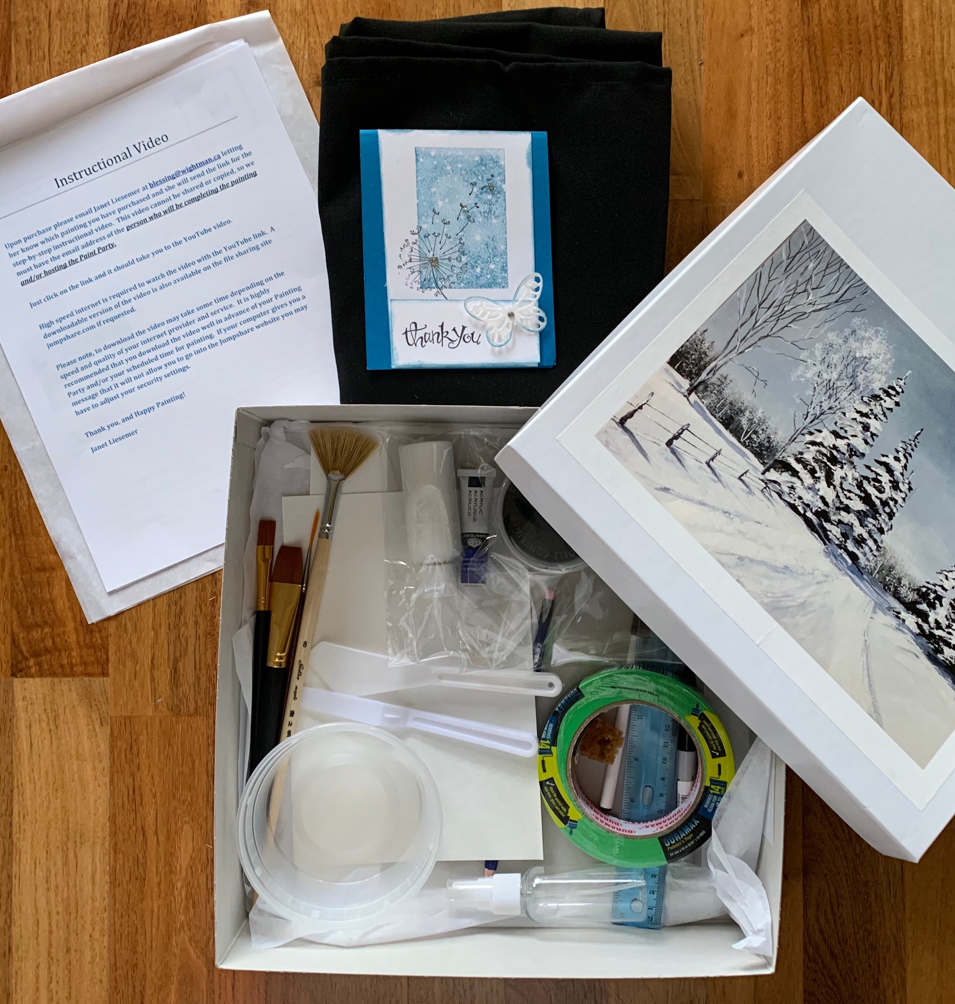 Everything you need to create this beautiful 9x12" acrylic painting is included in your Art in a Box kit. Upon purchase you will receive, a link for the step by step online video tutorial. Any skill level can complete this painting and in just a few hours you’ll be amazed with your creative ability. The palette knife and the fan brush will be demonstrated to create texture and realistic trees. This painting is recommended for ages 12+.