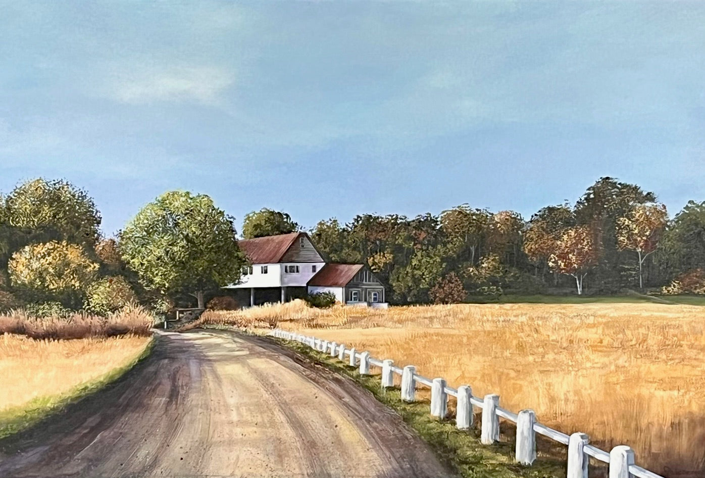 This is an enchanting acrylic painting that captures the essence of a bright summer day with a touch of English charm. A winding road leads to a quaint house nestled among the trees, with a white picket fence guiding the viewer into the scene. The warm colours against the vibrant summer sky evoke a sense of warmth and nostalgia. This piece invites you to imagine yourself strolling down the road, feeling the welcoming embrace of home. It's a perfect addition to any space, bringing a sense of comfort and idyllic beauty.