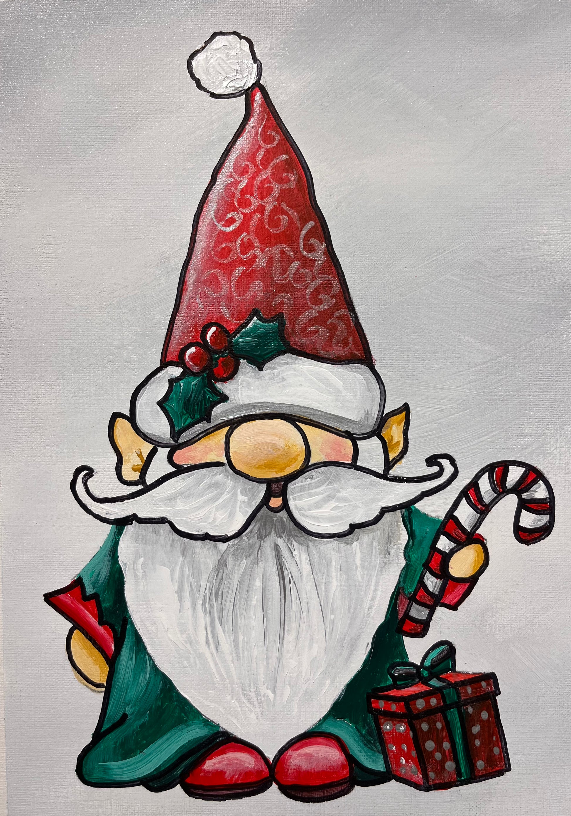 Complete this fun 9 x 12, acrylic Santa Gnome painting in just a few hours. Great for kids or adults and any skill level, including beginners. You receive everything you need to complete this painting inside the box along with a link to a step-by-step, instructional video. This painting is perfect for your own sip and paint party or an activity for the kids over the holiday break. No drawing skills are required.