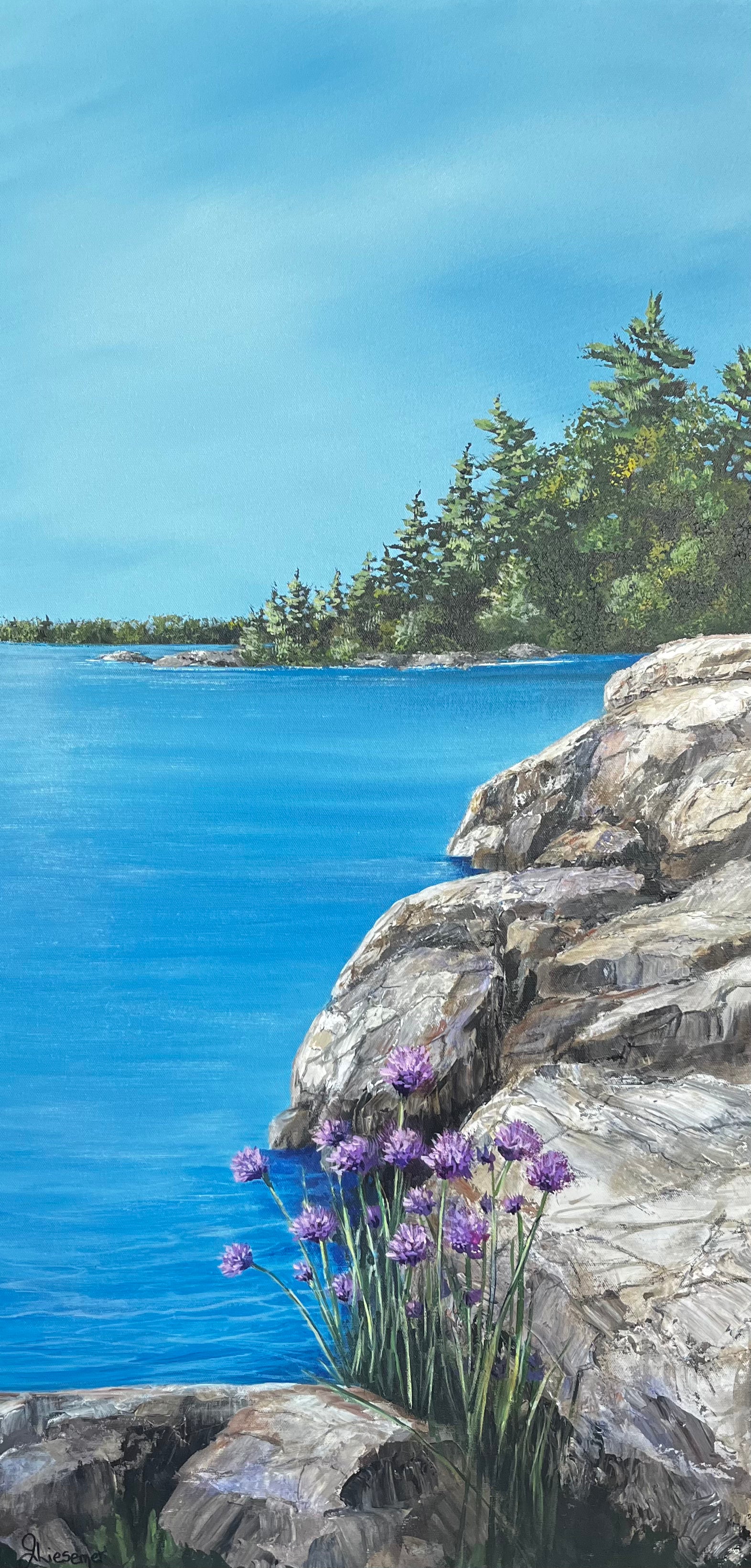 A peaceful shoreline scene where wild chive blossoms cling to the rocky edge, framed by sunlit granite and vibrant blue waters. This painting captures the quiet beauty of the Canadian Shield—where rugged stone meets delicate blooms and the lake stretches endlessly beyond.